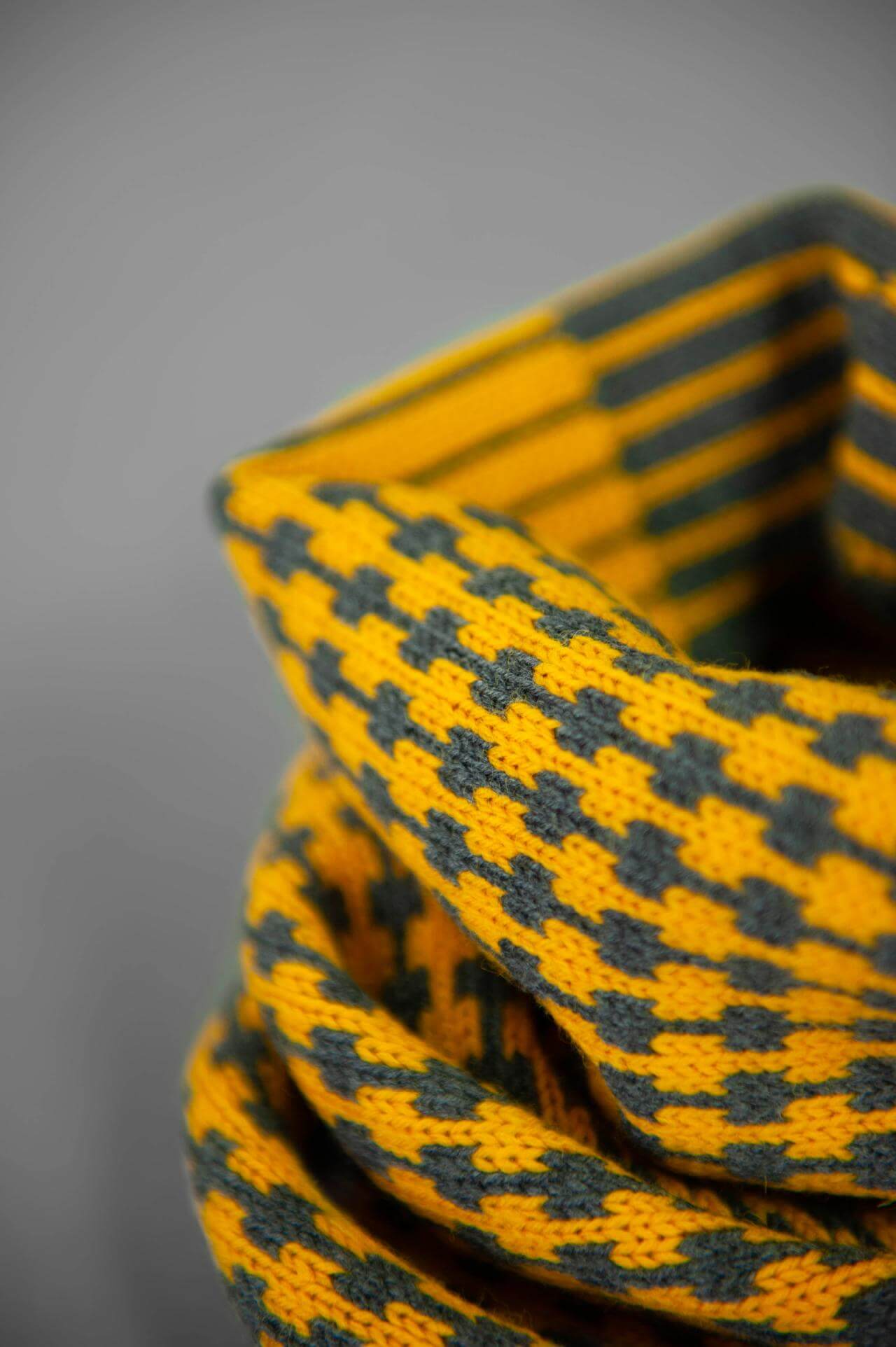 The cowls are realized using a hand domestic knitting machine. The pattern is originally designed and then transferred in a punched card, in accordance with the jacquard technique. The cowls are knitted in bold and contrasting colors. All the details as the sewing process are handmade. A lot of manual work goes into every garment we made, our clients know how special it is to wear a 100% handmade and long-lasting product. The cowls are made of 100% merino wool We choose wool for its many proprieties: it is super soft, warm, anti-bacterial, water-repellent, breathable, odour resistant, timeless and elastic.