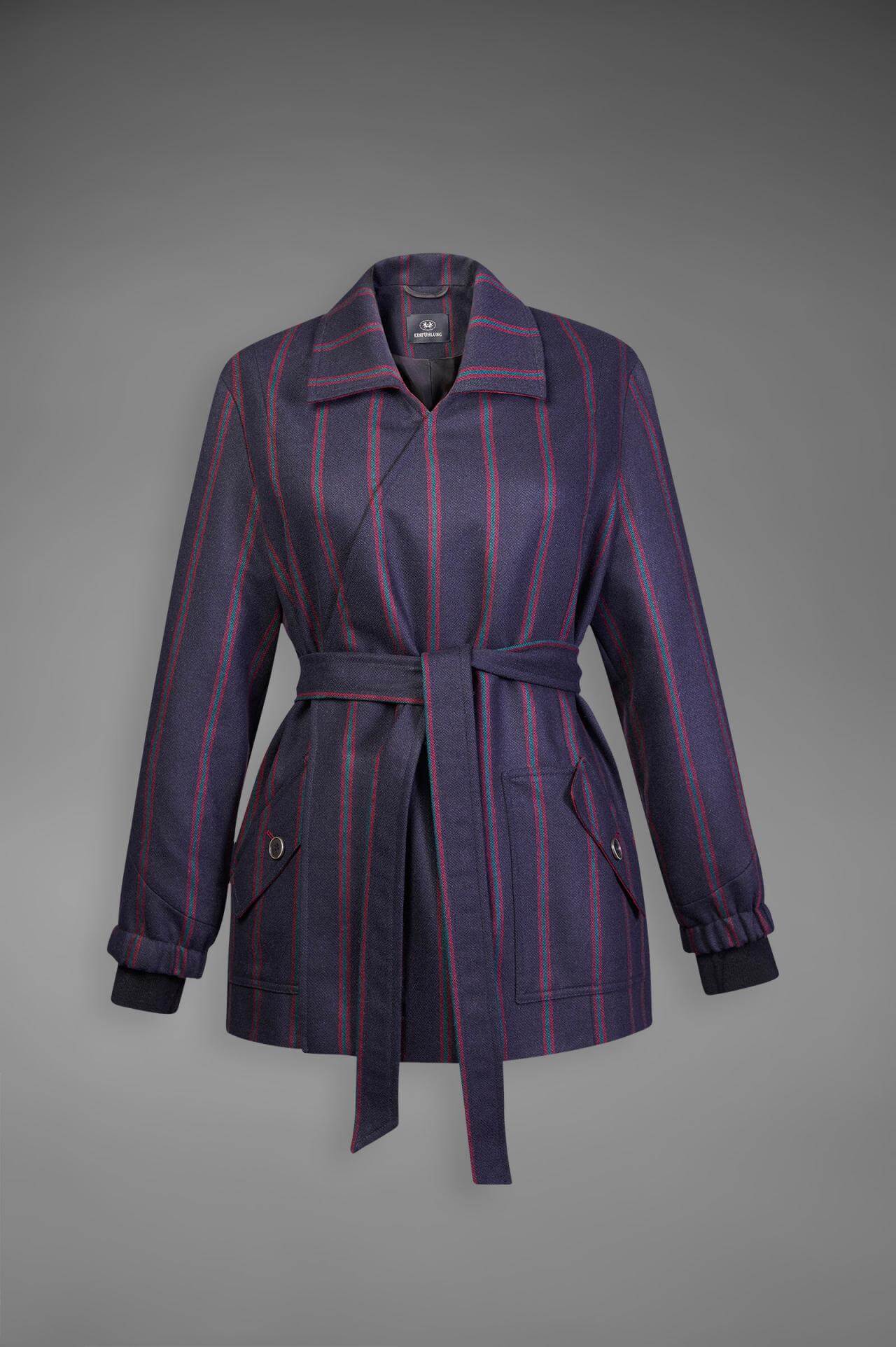 Wool double breast wrap Jacket with removable waist belt and side vents. Handmade knitted Wool cuffs. Patch pockets with flap. Viscose lining and consciously sourced Corozo buttons. Developed to be as sustainable as possible, from raw material to afterlife. Fully traceable. Made from top quality recycled wool with an addition of recycled polyester for strength and durability. Made in Italy - Composition: 60% Recycled Wool, 35% Recycled Polyester, 5% Recycled Polyamide Clean only at specialised cleaners. 2% of the sale will go to selected charity association.